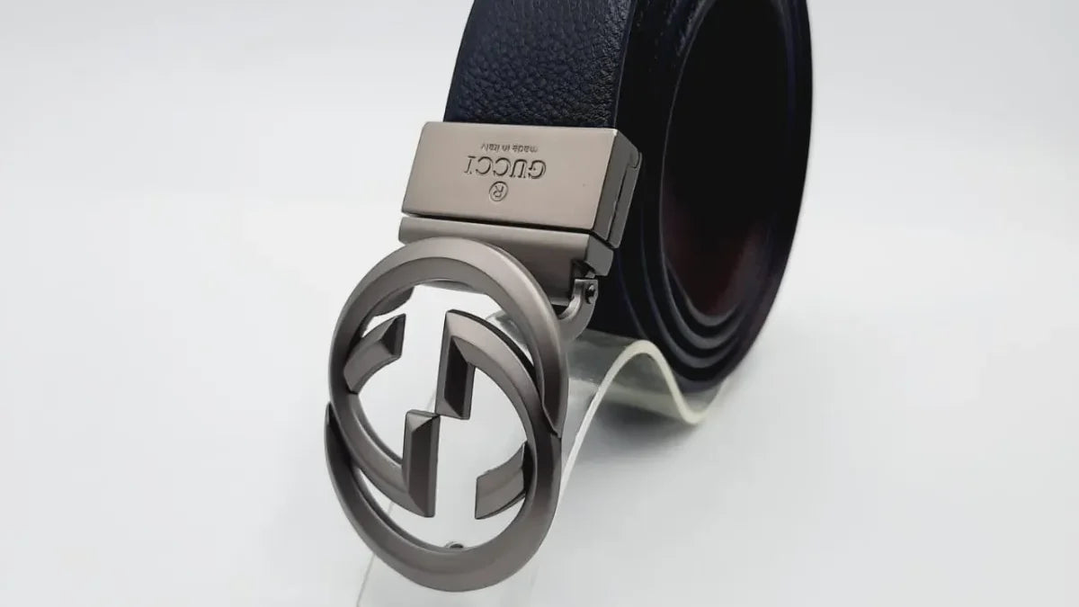 Buckle Style: Circular metallic buckle with mirrored “G” design