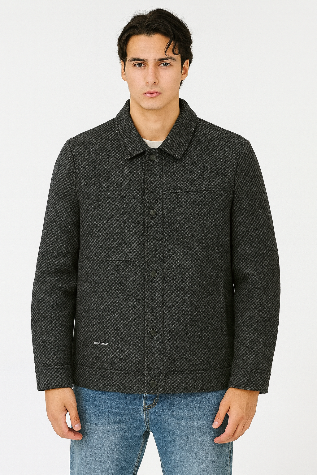 Crafted for understated sophistication, this charcoal wool-blend overshirt jacket features an all-over grid-textured pattern that adds depth and visual interest. Designed with a classic shirt collar, button-up front, and minimalist chest pocket seam, it blends smart styling with everyday comfort. A discreet embroidered logo near the hem adds a signature touch. Perfect for layering during transitional weather or wearing as a lightweight outer layer in cooler months.